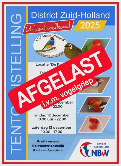 Helaas zijn wij getroffen door overmacht. In Streefkerk is vogelgriep geconstateerd. Onze district show zou plaatsvinden in Hardinxveld-Giessendam, maar helaas valt deze locatie binnen het gebied waar geen shows gehouden mogen worden.